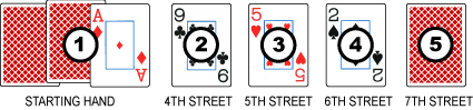 After all players have anted $.50, (1.) Each player is dealt two cards face down and one face up. The player with the highest up card* makes a forced bet of either $1 half minimum or $2 full bet (player’s choice) to start the game. The rest of the players, in clockwise order, either call the opening bet, raise it, or not call and “fold” their hands back to the dealer. (2.) All get a fourth card face up followed by a round of $2 betting. From this round on, the player with the lowest up card(s) is always first to check or bet. (3.) After the fifth card is dealt face up, the minimum bet goes to $4. (4.) The sixth card is dealt face up and there is another round of $4 betting. (5.) The seventh and last card is dealt face down and followed by the final round of $4 betting. The dealer then determines the winning low hand and awards the pot.